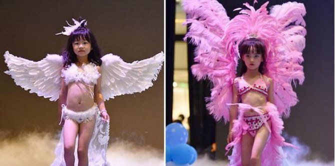 Victoria’s Secret gunakan model anak dalam pagelaran busana yang diadakan di China. Seorang anak dengan lingerie yang cukup heboh lengkap dengan bulu dan aksesoris lainnya tampak melenggang di panggung catwalk.