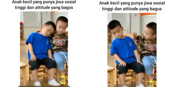Melihat temannya begitu mengantuk hingga hampir terjatuh, bocah bersepatu kuning di sebelahnya langsung tanggap menarik leher dan menempelkan kepala temannya ke pundaknya.