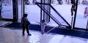 Sebuah video yang diambil dari rekaman kamera pengawas, menampilkan sebuah peristiwa anak tertimpa pintu kaca.