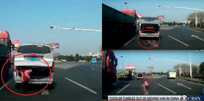 Kita memang tak pernah tahu apa yang akan terjadi pada balita kita yang sedang aktif-aktifnya. Seperti kejadian ini, secara tak terduga seorang balita jatuh dari pintu belakang mobil yang dikendarai oleh kakeknya sendiri.