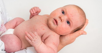 - Munculnya kemerahan di kulit wajah dan badan bayi