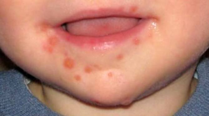Setelah sehari dua hari, muncul bintik merah yang melepuh di bagian mulut, telapak tangan, telapak kaki.