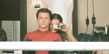 Tom mengunggah fotonya saat sedang memakai baju Spider-Man bersama Zendaya di pundaknya sedang memegang kamera.